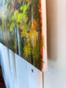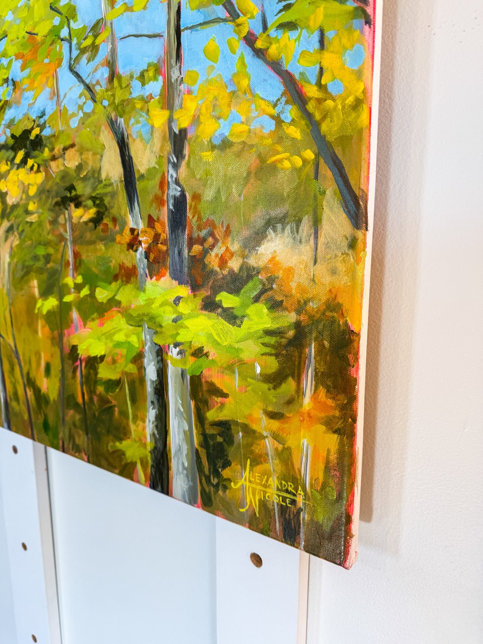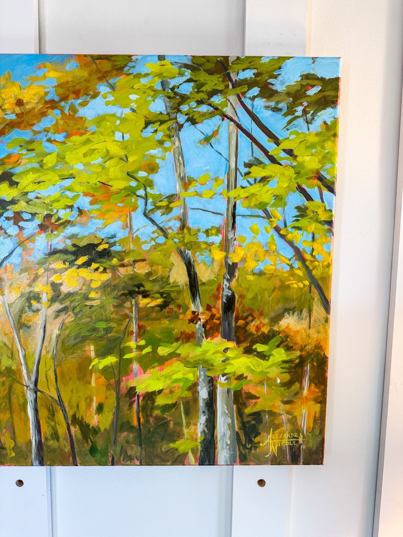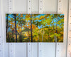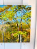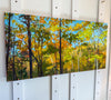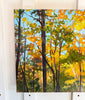 Standing in front of this piece feels like stepping into the woods on a bright fall morning, where dappled light pours through layers of gold, green, and amber leaves, illuminating everything in an autumn glow. This forest landscape painting brings a sense of peace, warmth, and groundedness into any interior.